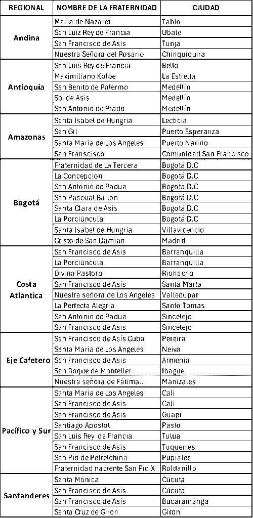 Se presenta a continuación las fraternidades que hoy hacen parte de la OFS Colombia y el lugar donde se encuentran.